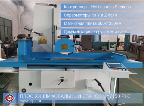Станок плоскошлифовальный MY7150-PLC оснащен автоматизированной системой управления на базе контроллера Siemens S7-200 Smart и сенсорной панелью оператора для ввода параметров и задания режимов работы (интерфейс на русском языке), расположенной на поворотной консоли. Вертикальная и поперечная подачи осуществляются при помощи сермомоторов Siemens, обеспечивающих прецезионную точность и надежность. Большая магнитная плита размером 500х1250мм позволяет устанавливать и обрабатывать габаритные детали до 600мм шириной и до 1300мм длиной, а двигатель привода шлифовального круга мощностью 7.5кВт обеспечивает высокую скорость шлифования.